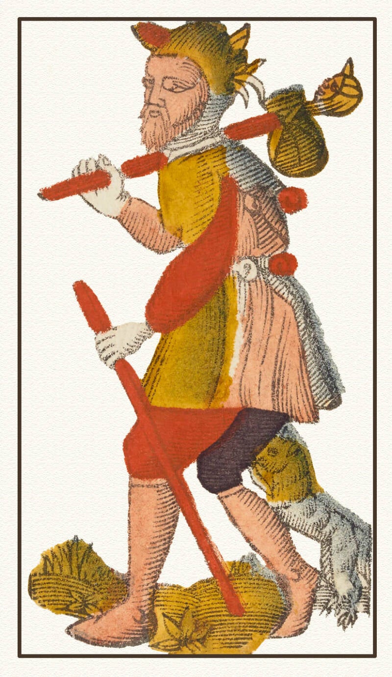 El Mercurio no descansa; es el principio que corre por las venas de la Gran Obra. En la imagen, el Loco no tiene hogar, está de paso. Representa al Mercurio que debe ser "buscado en todas partes" pero que pocos saben reconocer bajo su disfraz de mendigo (materia vil).